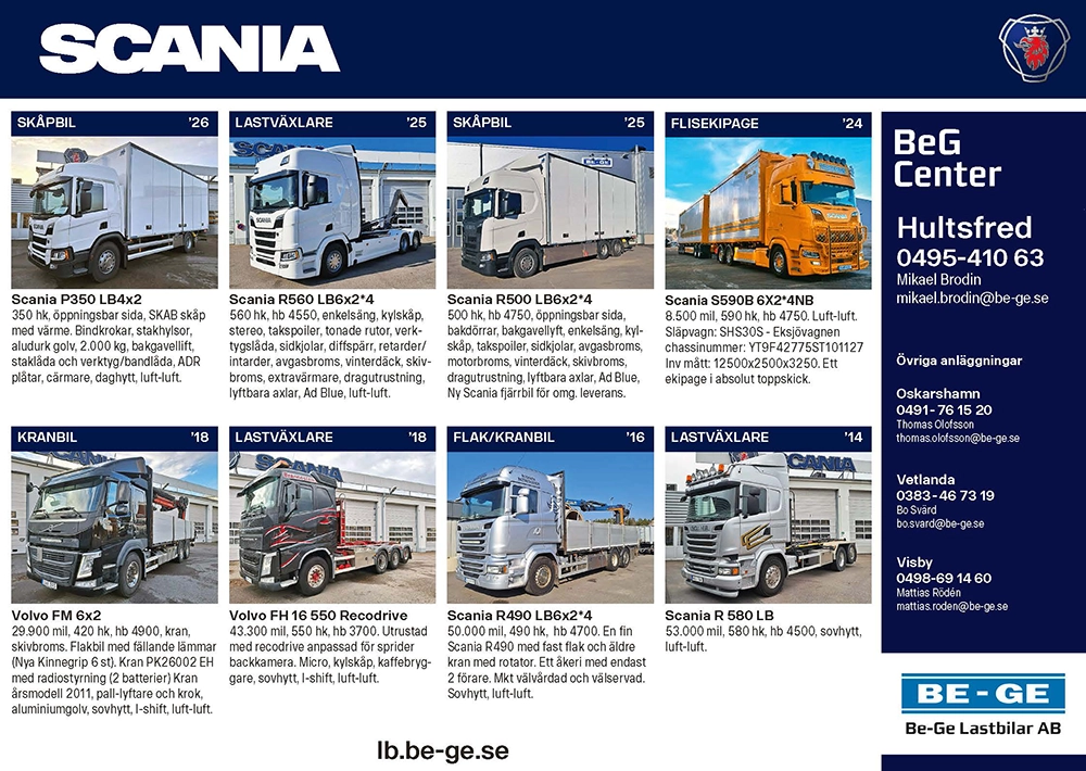 Begagnade fordon för omgående leverans hos oss på Be-Ge Lastbilar AB.