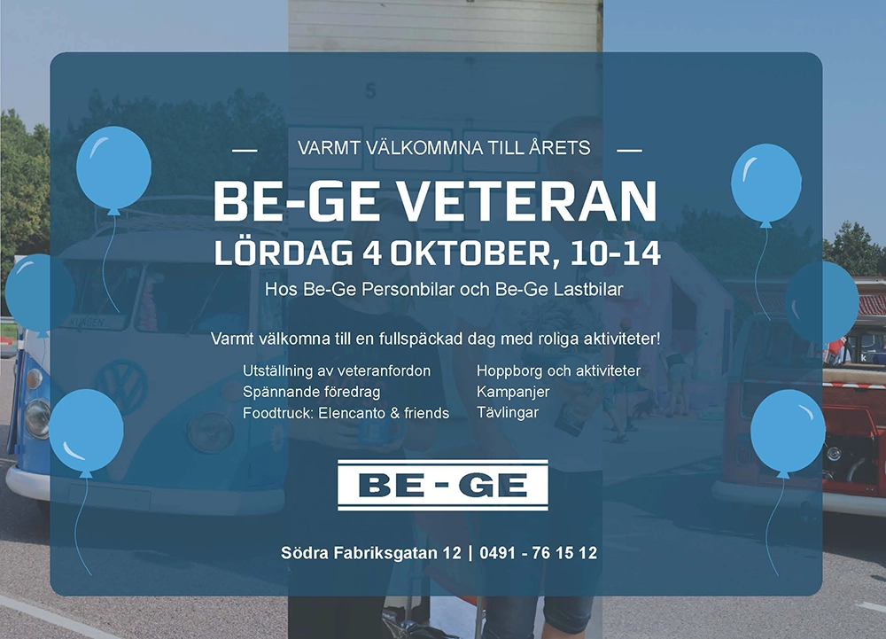 Lördagen den 4 oktober kl. 10.00–14.00 bjuder vi in till årets upplaga av Be-Ge Veteran. Det blir en dag fylld med aktiviteter, utställningar och trivsam gemenskap för hela familjen.